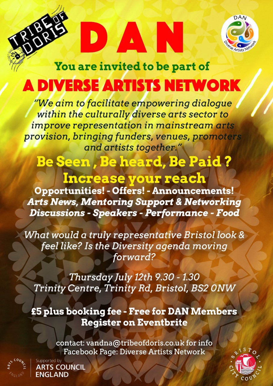 In 2016 Tribe of Doris launched the Diverse Artists Network in Bristol, the aim being to bring together artists, venues and promoters so they can network and create partnerships. It has helped people working across the arts sector to understand the challenges faced by under represented artists hearing first hand what would make a difference. Tribe of Doris received Arts Council Funding to organise DAN networking meetings and CPD sessions and the momentum has led to individual and organisational memberships to take DAN forward.