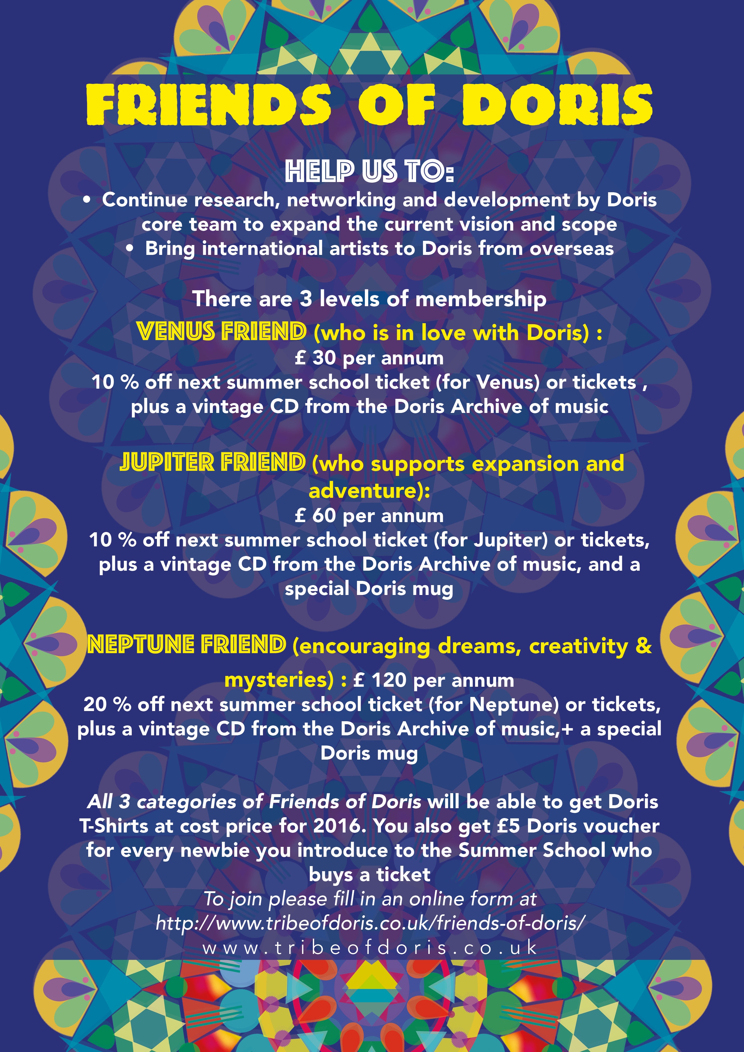 It’s been a long time coming, but Tribe of Doris has officially launched its’ Friends of Doris Membership Scheme in anticipation of our 25th Anniversary next year! Formed in 1991 by Deasy Bamford and Siobhan Kierans, many supporters have suggested that we honour Tribe of Doris loyalty with a membership scheme. So we have created three levels of membership to suit all pockets. This will help us to continue research, networking and development to expand the current vision and scope of what we do. It will also enable us to bring high profile artists to Doris in the future.